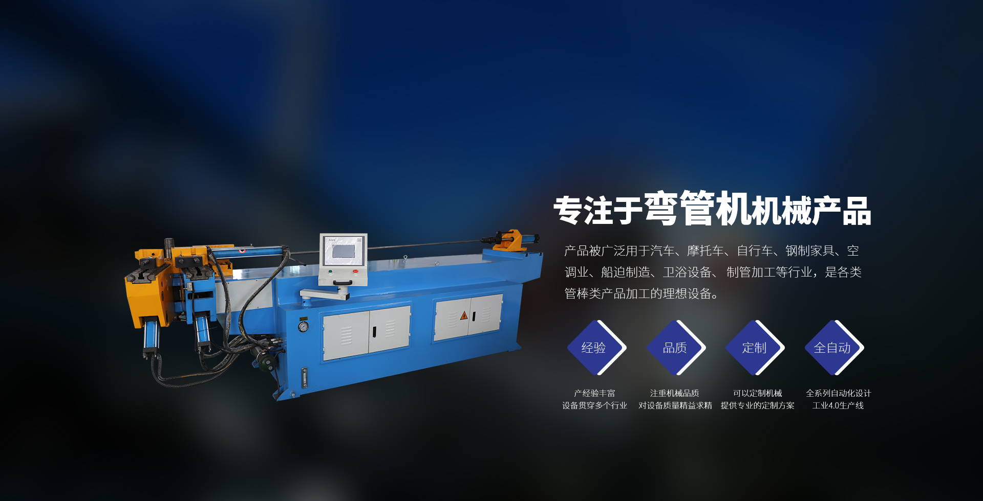 廣泛用于汽車、摩托車、自行車、鋼制家具、 空調業、船迫制造、衛浴設備、制管加工等行 業,是各類管棒類產品加工的理想設備。